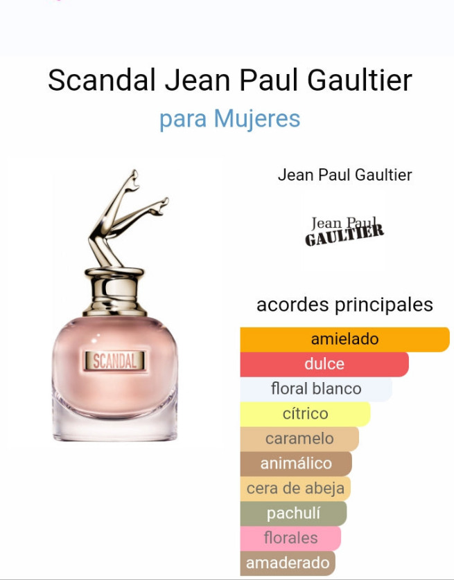 Scandal de Jean Paul Gaultier es una fragancia de la familia olfativa Chipre Floral para Mujeres. Scandal se lanzó en 2017. Scandal fue creada por Daphné Bugey, Fabrice Pellegrin y Christophe Raynaud. Las Notas de Salida son naranja sanguina y mandarina; las Notas de Corazón son miel, gardenia, flor de azahar del naranjo, jazmín y durazno (melocotón); las Notas de Fondo son cera de abeja, caramelo, pachulí y regaliz.
